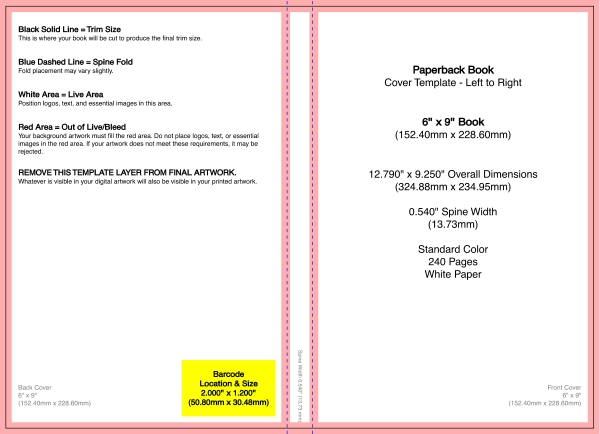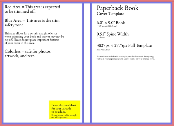 Amazon furnishes two template documents which are to scale. The one below is a layout of the entire cover. Note that it is blocked out to show the various regions of the cover.