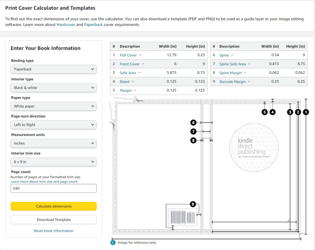 In addition to the image file above, Amazon also furnishes a dimensional template, as shown below. The actual measurements are created after the author enters the book information at the left.