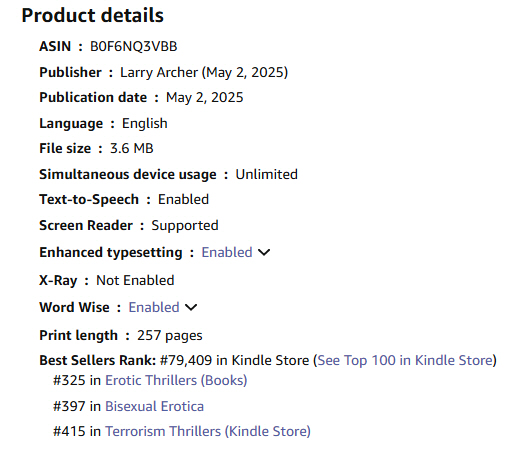 The story is doing pretty well for just being out for a few days. Its Amazon Best Sellers Rank is 300 – 400, depending on the category, and it is selling well.